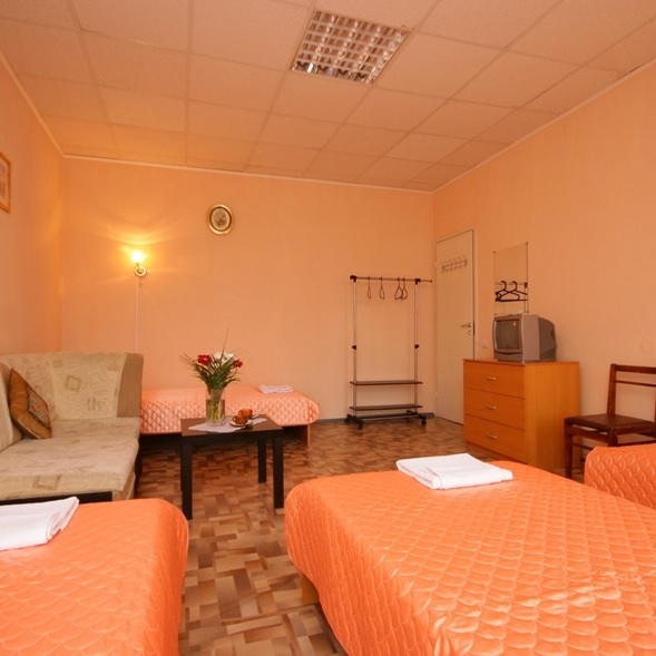 В номере: Пять удобных односпальных кроватей, тумбочки, диван, журнальный стол, бра, зеркало, постельное белье, полотенца, вешалка для одежды, плазменный телевизор.